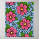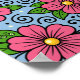 The design features large stylized flowers with rounded petals and a bright circular center. The flowers are drawn with thick black outlines that give them a clear, graphic look. Surrounding the flowers are smooth leaves with simple vein details, also outlined in black. Curved decorative lines and small dot-like shapes add a playful, flowing feeling to the design. The color palette includes strong pink for the flowers, fresh green for the leaves, warm yellow for the centers, and a calm light blue background. The contrast between the bold outlines and flat colors creates a lively and cheerful visual style with a slightly whimsical character.