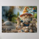 Image mignonne d'un gnome de plage assis sur un trône de sable à la plage avec des mouettes autour.