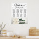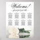 Ce magnifique plan de table de mariage comprend 8 tables et met en valeur un design floral moderne et romantique. Une rose de couleur ivoire, blanche ou crème à longue tige est posée sur le côté, se reflétant dans un bassin d'eau, ce qui ajoute à l'élégance du plan. Le titre « Bienvenue ! Veuillez trouver votre table » est écrit en élégante calligraphie, tandis que les noms des mariés et la date du mariage figurent en bas. Avec des dispositions de sièges pour 80 personnes et 10 places par table, ce plan de table est un excellent moyen d'accueillir les invités et de les aider à trouver leur place à la réception.