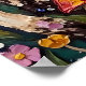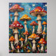 Ce tableau offre une vue imprenable sur un sol de forêt grouillant de champignons colorés. L'oeuvre présente une texture d'impasto lourde, avec des touches épaisses et distinctes qui donnent à chaque champignon une forme sculpturale. Diverses espèces de champignons sont représentées, mettant en vedette des casquettes dans des tons vifs de rouge, d'orange et de bleu, dont beaucoup sont ornés de taches blanches. De petites fleurs et des feuillages verdoyants remplissent l'arrière - plan bleu profond, créant une scène magique et légèrement surréaliste.