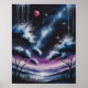A cosmic night scene in watercolor featuring a swirling Milky Way galaxy above silhouetted twisted trees and a calm reflective lake. A large red moon glows alongside dripping icicle-like clouds in deep blues, purples, and whites, blending surreal fantasy with starry wonder.