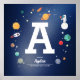 Joli affiche de monogramme personnalisé bleu marine avec les différents objets spatiaux. Vous pouvez facilement déplacer tous les objets (ou modifier la taille de la lettre) dans l'outil d'édition.