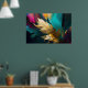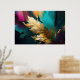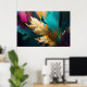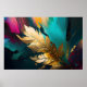 Cette œuvre d'art abstrait sophistiquée est centrée sur une seule plume dorée, rendue dans un or lumineux sur un fond dramatique de teintes sarcelle foncé, noir et tons de bijoux riches. La texture métallique de la plume attire immédiatement l'œil, symbolisant la légèreté, la liberté et la force tranquille, tandis que les coups de pinceau expressifs et les champs de couleur superposés créent de la profondeur et un contraste moderne.