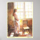 La lumière du soleil coule à travers une fenêtre, éclairant une jeune femme en or comme elle se tient et rêve de l'avenir. Par l'artiste P Allingham Carlson, une nouvelle oeuvre en aquarelle.