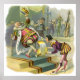 Illustration classique vintage de livre d'histoires de comptines pour enfants mettant en vedette le vieux roi Cole. Il a un serviteur s'inclinant devant sa majesté royale le roi qui tient sa couronne et donnant un coup de pied dans un plateau avec un bol de nourriture et une boisson.