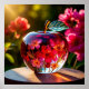 Une sculpture de pomme en verre décorative vibrante mettant en valeur des reflets, entourée de fleurs vives, capturant la beauté de la nature avec la lumière chaude du soleil et la verdure luxuriante dans un cadre extérieur.