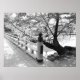 Photo en noir et blanc d'un arbre éclairé par le soleil à côté d'un pont japonais en bois.
