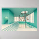 Un intérieur serein et minimaliste avec une palette de couleurs turquoise frappante. L'espace est défini par des lignes géométriques propres, avec de grandes fenêtres laissant entrer la lumière naturelle qui inonde la pièce. Deux arbres aux feuilles automnaux se dressent au centre, partiellement immergés dans une piscine réfléchissante qui reflète l'architecture environnante. Le design évoque la tranquillité et le sens de l'équilibre, mêlant nature et formes contemporaines.