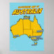 Cette carte illustrée de l'Australie est rendue dans un style pop art dynamique. La carte est dessinée en noir et remplie d'une couleur jaune vif, placée contre un arrière - plan bleu avec un motif pointillé. Les principales villes d'Australie sont étiquetées en boîtes bleues