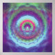 Iridescente Portal est un modèle de mandala psychédélique éthérée kaléidoscopique en cyan, magenta et vert.