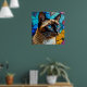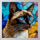 Une représentation artistique captivante d'un chat siamois, mettant en vedette de superbes yeux bleus sur un fond abstrait dynamique et coloré. Parfait pour les thèmes des animaux de compagnie, de la créativité et de l'expression artistique.