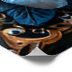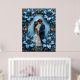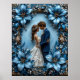 Belle scène de mariage mettant en vedette un couple s'étreignant dans un design floral orné avec des teintes bleues riches.