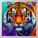 Représentation vibrante et frappante d'un tigre, caractérisé par sa fourrure richement colorée, principalement orange avec des rayures noires audacieuses. Le visage du tigre est à l'avant et au centre, montrant ses yeux jaunes-verts intenses qui attirent le spectateur. L'arrière - plan est constitué d'un dégradé coloré, mêlant des tons turquoise et violet, ainsi que des éclats de couleur abstraits qui accentuent l'impact visuel global. La texture détaillée de la fourrure et les caractéristiques expressives du tigre contribuent à une représentation dynamique et attrayante de cet animal majestueux.