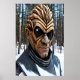 Un alien brun aux grands yeux noirs debout dans la forêt d'hiver. C'est un art généré par l'IA.