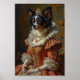 Un élégant portrait royal représentant le gracieux Papillon dépeint en princesse française. Inspiré des peintures à l'huile classiques européennes, le design met en valeur les oreilles emblématiques en forme de papillon et la robe soyeuse de la race avec une tenue royale luxueuse et une tiare ornée de bijoux.