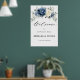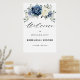 Une affiche de bienvenue pour dîner de répétition floral bleu poussiéreux avec un bouquet élégant de bleu marine, bleu royal, blanc, or, champagne ivoire, rose blush, boutons de fleurs de renoncule et feuilles d'eucalyptus sauge vert et bouquet aquarelle élégant. N'hésitez pas à me contacter pour toute aide de personnalisation ou si vous avez besoin d'un autre produit avec ce design.