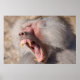 Un babouin mâle, puissant et puissant, bâillonne, brille des dents pointues dans une image captivante. Le moment est gelé, mettant l'accent sur la force et l'énergie primale.