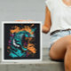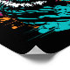 L'image représente un tigre féroce rugissant, sa bouche large ouverte, révélant ses dents acérées. La fourrure du tigre est un mélange éclatant de turquoise et de blanc, avec des rayures plus foncées ajoutant profondeur et texture. Ses yeux sont intenses, et ses whiskies proéminents. L'arrière - plan est une toile noire avec des éclaboussures de peinture orange et violette, ajoutant à l'atmosphère dynamique et énergique de l'image.