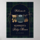 Welcome guests in style with this elegant baby shower sign, decorated with green and navy tartan plaid, a classic teddy bear, and a clothesline with adorable preppy baby clothes. A great addition to a polo-style shower theme.