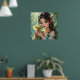 A pretty anime elven fairy holding her cute green and gold baby dragon poster.