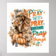 Design paisible et coloré avec une scène automne/automne avec tête de lion majestueuse, citrouilles et fleurs automne. Le texte inspirant et coloré dit : "Priez dessus, priez dessus, priez à travers". Ce design est disponible sur une grande variété de produits.