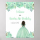 Ce panneau de bienvenue de fête d'anniversaire présente des fleurs faussement scintillantes de couleur verte menthe et une belle princesse à peau foncée avec une robe élégante. C'est parfait pour une fête d'anniversaire.