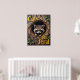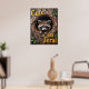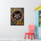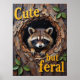 Cette oeuvre d'art attachante montre un raton laveur niché dans un grand nid circulaire marron intégré à un mur en bois. Le regard du raton laveur est direct et captivant. Le décor en bois est foncé et soigné, les petits feuilles verts apportent une touche de couleur. Le texte "'Cute but feral'" est un ajout ludique, avec une police jaune surélevée.