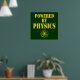 Powered By Physics - pochoir jaune lettrage et graphisme atome avec un arrière - plan vert foncé.