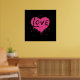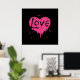 Un coeur rose chaud éclaboussé sur noir avec le mot "Amour" peint éclaboussé dessus. Montré ici sur une affiche.