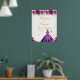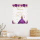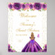 Ce panneau d'accueil élégant et glamour en sweet sixteen présente une belle princesse aux cheveux blonds et à la peau claire dans une robe violette foncée. Le texte combine écriture manuscrite et polices sans serif modernes pour un look élégant et sophistiqué. Les compositions florales, les papillons et les confettis d'or créent un mélange parfait de rustique et de chic. Graphiques par www.etsy.com/uk/shop/SunflowerDayLove
