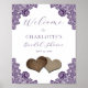 Elegant rustic purple bridal shower welcome sign featuring delicate floral lace and two burlap hearts. Matching items available.
