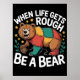 Cette illustration éclatante présente un ours coloré à la cravate joyeux tenant une casserole de miel. Le texte "When Life Gets Rough, Be a Bear" entoure l'ours, créant un thème stimulant et motivant. Le design coloré et dynamique capte un sentiment de résilience et de positivité, parfait pour transmettre un message de force et de persévérance face aux défis.