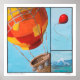 Un trio d'images fantaisistes d'une montagne, un ballon rouge échappé volant haut avec les oiseaux, et une montgolfière vide sont montrés dans cette impression colorée d'une peinture de tempéra originale.