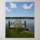 A weathered wooden dock stretches out across calm water beneath a bright blue sky in Michigan’s Upper Peninsula. Surrounded by forest and still water, this peaceful lakeside scene captures the quiet beauty of northern Michigan summers.