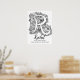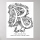 Joli R monogramme noir encre dessin style zen doodle. Le nom de l'art et le sens de l'affiche d'art de gribouillis est parfait pour une chambre pour filles. Personnalisez avec le nom de votre enfant commençant par R, et le nom signifiant une touche vraiment personnalisée à la chambre ou à la crèche de votre enfant, cet exemple est pour le nom Rachel A ewe. Forte volonté, intelligente et gentille, une amie aimante. Choisissez la finition mate poster et vous pouvez la colorier ou le donner à un ami qui aime la coloration. © Unique R dessin monogramme comportant des éléments commençant par R, des lapins, des arcs-en-ciel, des roses, des fusées et des framboises. Description dessin original et design d'encre par Sarah Trett. www.sarahtrett.com pour www.mylittleeden.com