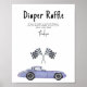 Carte d'invitation baby shower à thème de voiture de course avec des illustrations aquarelles d'une voiture vintage violet (violet) et drapeau noir - blanc. "Course pour un baby shower."