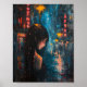 "Rainy Rhapsody : A Serenade in the City" est une peinture à l'huile expressionniste qui capture avec éloquence la solitude introspective d'une soirée pluvieuse dans la ville. Le sujet, une femme voilée dans l'ombre, est un observateur silencieux de l'orchestre des lumières de la ville et des rues peintes à la pluie. Sa position contemplative et la subtile lueur des lampadaires qui la frappent créent un récit à la fois énigmatique et profondément émotionnel. Les bleus et les rouges vibrants de l'environnement urbain scintillent à travers la pluie comme des notes d'une symphonie visuelle, se reflétant sur le trottoir humide, créant une qualité surréaliste et de rêve. Les traits épais et texturés de la peinture et l’interaction de la lumière et de l’ombre ajoutent à sa profondeur atmosphérique, invitant le spectateur à un moment suspendu entre le chaotique et le serein. Cette pièce est une entrée de conversation parfaite pour n'importe quel espace, idéal pour les collectionneurs qui apprécient l'art qui évoque l'humeur et l'histoire. Il est adapté à l'exposition dans les collections privées et publiques, offrant une fenêtre sur un moment de solitude urbaine qui résonne avec l'âme de la vie citadine. "Rainy Rhapsody" n'est pas seulement un tableau, c'est une expérience poignante qui parle au coeur de quiconque a trouvé de la beauté dans les moments tranquilles d'un paysage urbain pluvieux.
