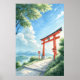Peaceful watercolor of iconic red torii gate on stone path with blue sky and greenery. Inspiring Japanese shrine art perfect for travel enthusiasts and creating serene, spiritual spaces.