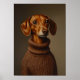 L'oeuvre représente un portrait très réaliste et stylisé d'un dachshund portant un pull-overs brun texturé et confortable. Les yeux expressifs du chien et la fourrure détaillée sont capturés avec une qualité presque photographique, donnant à la pièce une atmosphère chaleureuse et intime. L'arrière - plan muet vient compléter les riches tons du manteau et du pull de la dachshund, mettant en évidence l'apparence digne mais adorable du sujet.