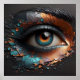 Portrait serré capturant le beau oeil d'une femme dans un style abstrait unique. Avec une touche de couleur cuivre et turquoise sur une toile de charbon de bois, les éléments gaufrés créent une représentation photoréaliste à la fois frappante et artistiquement distinctive.