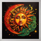Une face de soleil entourée par la lune et les étoiles dans l'espace avec des couleurs rouge, or, vert reggae