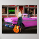 Belle femme devant un diner des années 50 et une voiture convertible de 1956 tenant sa guitare Rockabilly