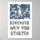 Stay focused on your goals, passion, and purpose with this stunning inspirational wall art. This unique poster features a striking graphic of looking up through dark blue forest trees towards a brilliant, sunlit sky, paired with the powerful, hand-painted quote, "Remember Why You Started". It serves as a daily affirmation and a bold reminder to persevere through challenges and keep sight of your initial drive.