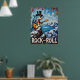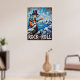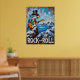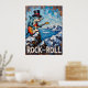 Cette oeuvre d'art fantaisiste présente un requin cool portant un chapeau et des lunettes de soleil, jouant une guitare électrique sur une montagne enneigée surplombant une mer bleue et glacée. L'arrière - plan montre des pics enneigés lointains sous un ciel nuageux. Le tableau utilise des touches épaisses et texturées, donnant une sensation ludique mais dynamique à la scène, avec "ROCK and ROLL" emblaqué ci-dessous.