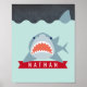 Cette affiche de nurserie et de chambre d'enfants mignonne présente un fond bleu marine avec une gueule de requin ouverte sous l'eau bleu clair et une nageoire de requin au-dessus de l'eau. Personnalisez selon vos besoins. Vous pouvez trouver plus de produits assortis dans ma boutique.