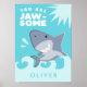 Joli décor mural pour chambre de garçon. Illustration d'un requin sortant de l'océan avec un sourire sur le visage. Il y a une marque de morsure dans le coin supérieur droit. Le texte ci-dessus indique "Vous êtes FORMIDABLE". Personnalisez ce produit en ajoutant le nom de votre enfant en bas du produit. Parfait pour une chambre ou une nurserie sur le thème nautique pour garçon.