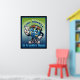 Belle illustration du monde avec une couronne de fleurs, un signe de paix et des hauts sommets noirs et blancs. Les mots "Stay Super" sont écrits au-dessus du globe en dessin dans le style des années 70 avec "In Frankie's Room" sous une amusante police bleue. Les mots en bas sont parfaitement changeables pour dire ce que vous voulez.