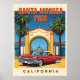 Une Cadillac rouge vintage se rend à l'entrée emblématique de Père Noël Monica Pier sous un ciel bleu vif, évoquant les classiques de la Californie.