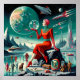 Lost in Dream Land. Retro-futuristic illustration with a surreal, science fiction theme. It features a woman with fair skin and stylized facial features, wearing a red dress and matching gloves, sitting on a rock. She holds a small astronaut figure encased in a glass dome.
