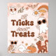 Ajoutez une vibe rétro ludique à votre fête d'anniversaire d'Halloween avec ce panneau No Tricks Just Traite! Doté de polices super, de fantômes gais et de couleurs d'inspiration vintage, il est parfait pour accueillir les clients ou décorer votre table de régal.
